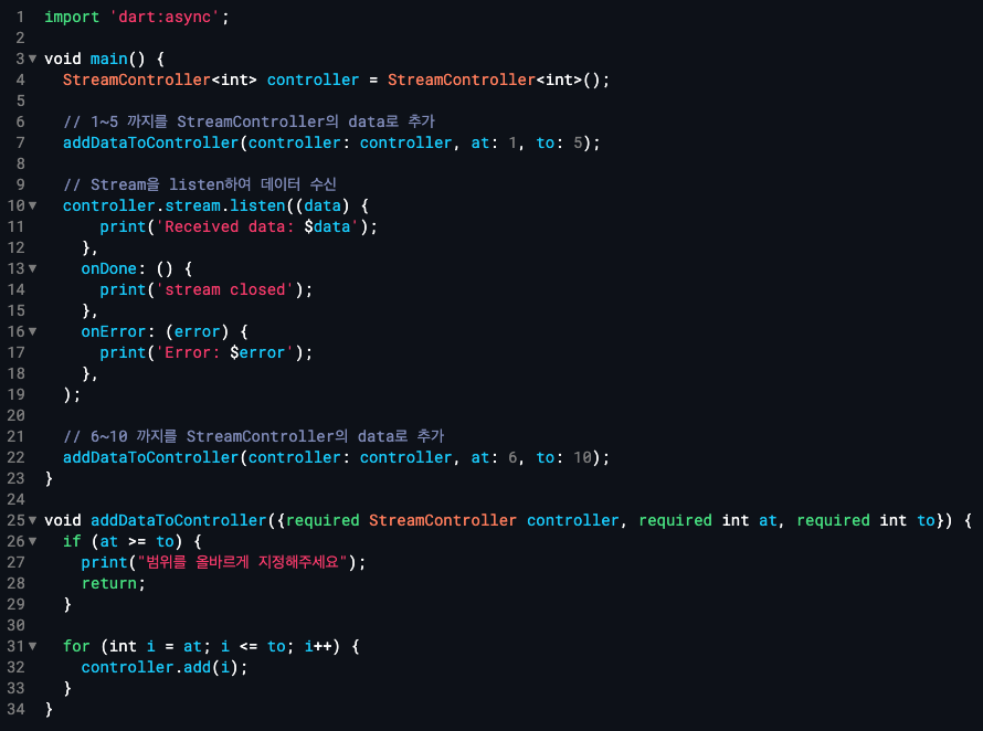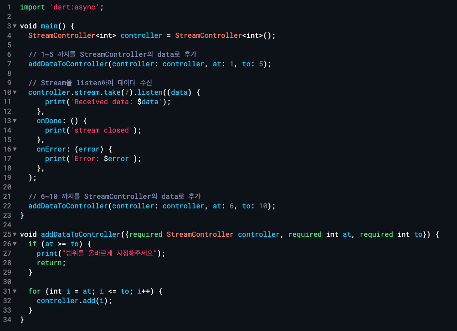 : streamController에서 받는 값을 int라고 지정하고 controller 변수를 선언 및 초기화