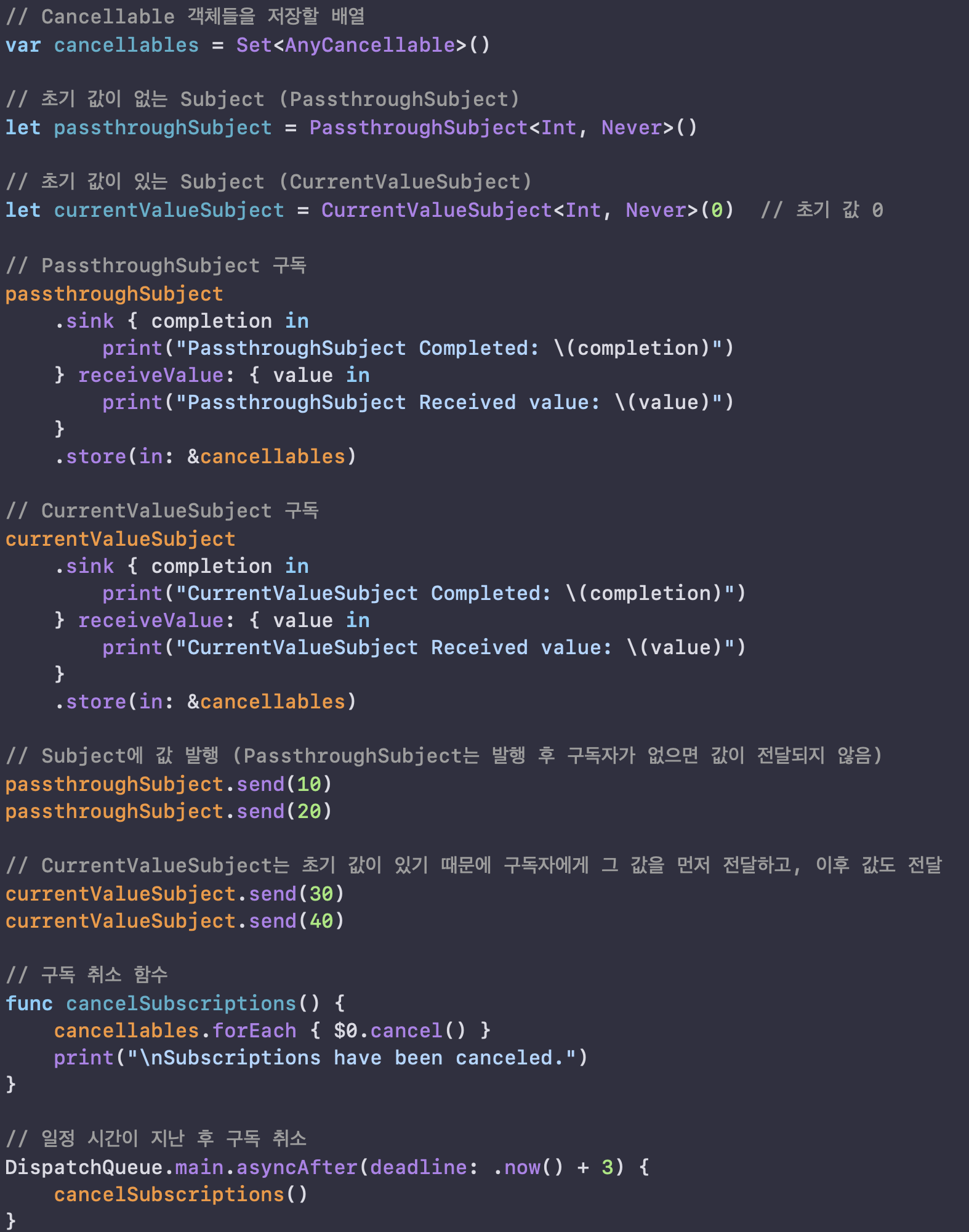 구현 시, Subscribe 쪽에서 수신 연결을 할 때, 해당 객체를 Cancllable 객체에 store해서 수신이 끝나면 cancle 하도록 설정합니다.