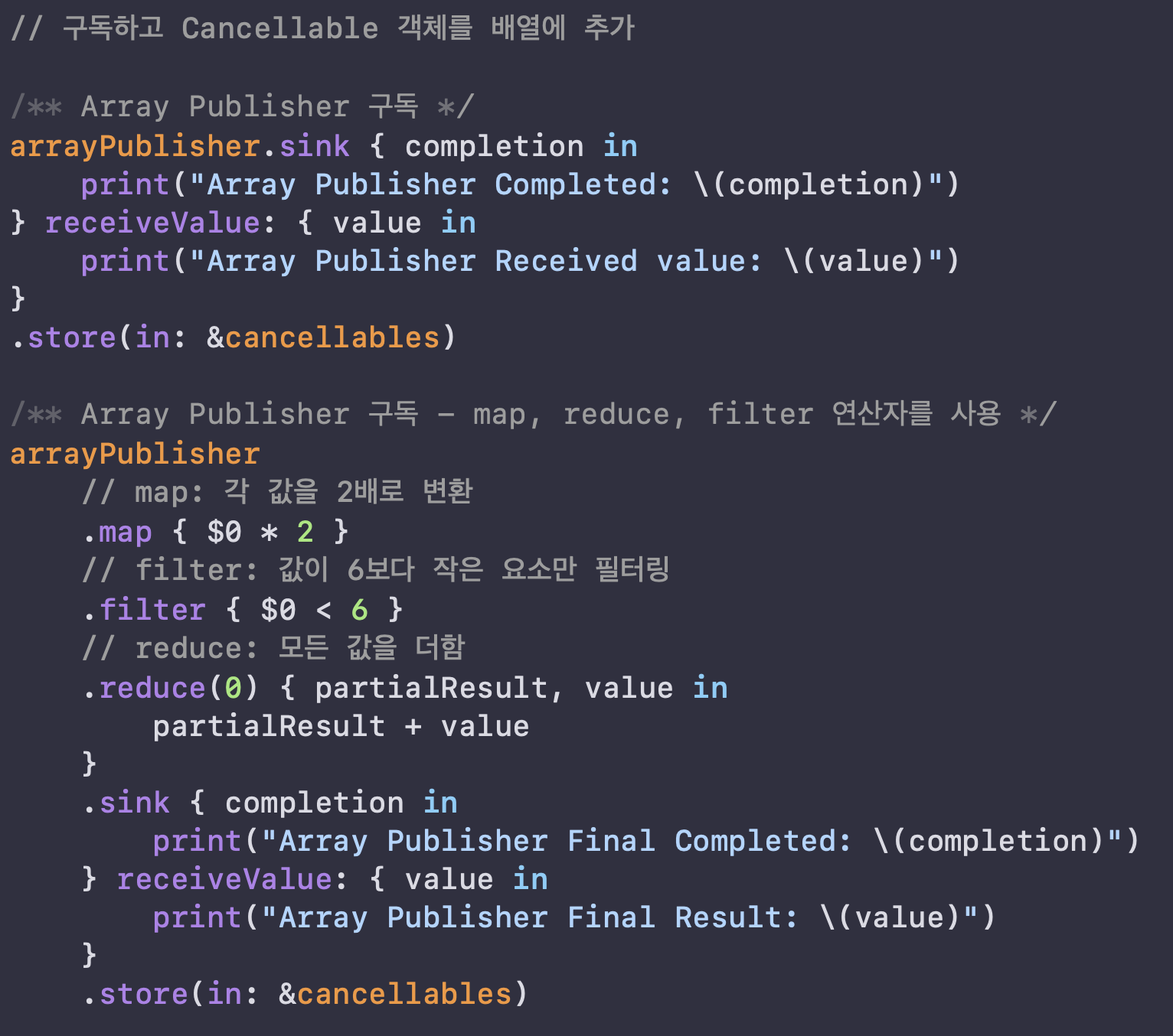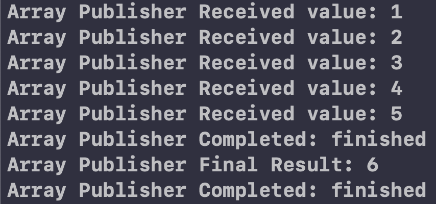 arrayPublisher를 수신할 때, 위에서 말한 3개의 함수형 operator를 다 넣어서 실행해봤습니다.