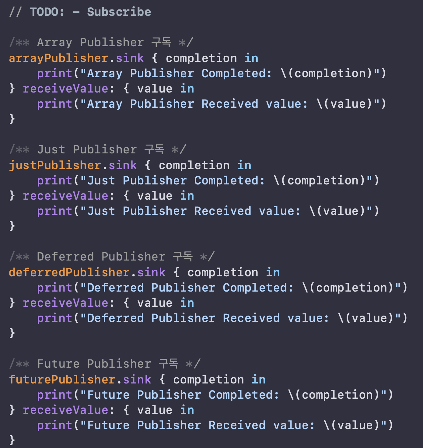 보통 구현을 할 때, Publisher 라는 객체를 만들고 뒤에 .sink 또는 .assign 클로저를 활용하여 수신을 표현합니다.
