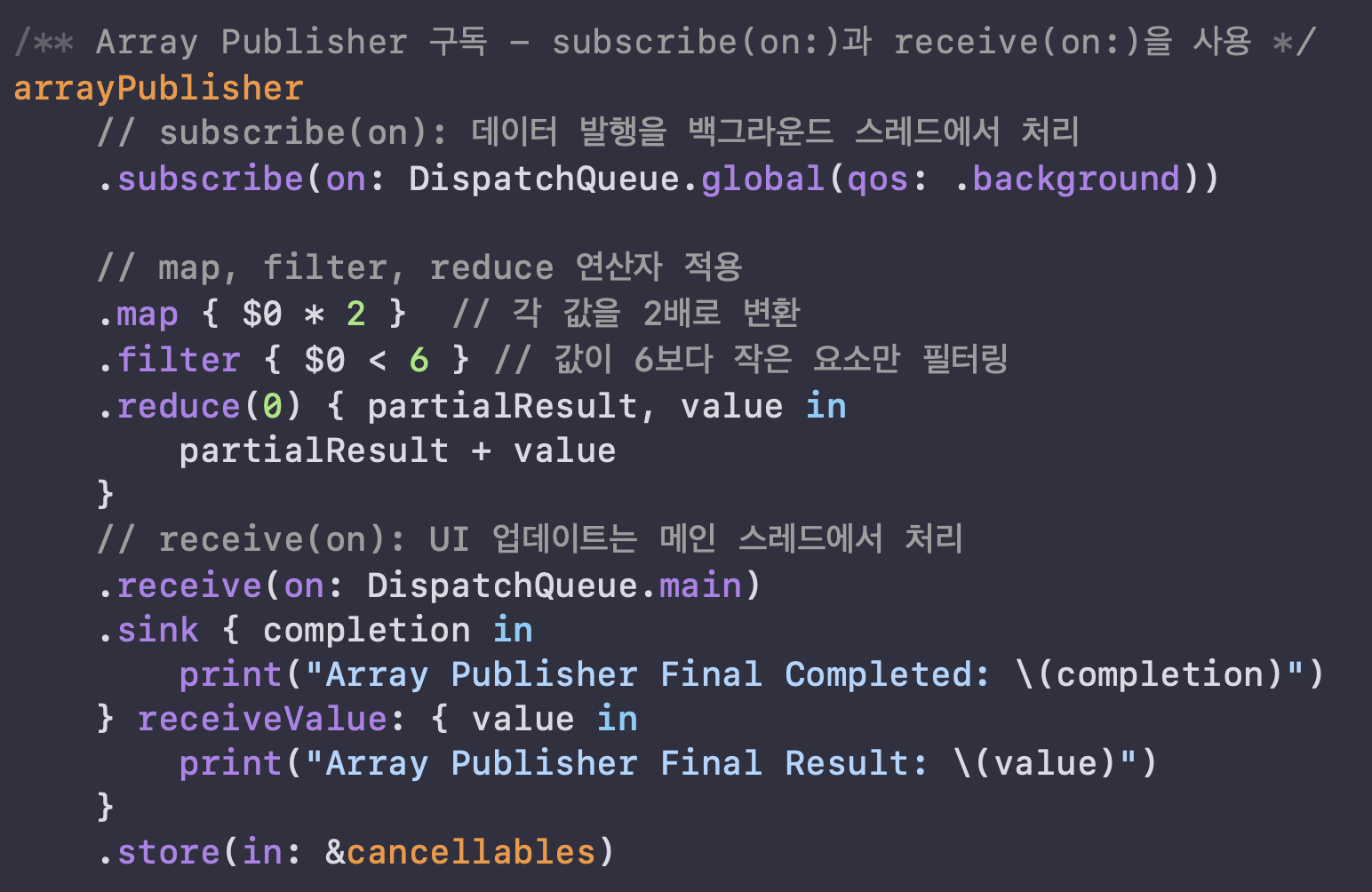 arrayPublisher를 수신할 때, 위에서 말한 3개의 함수형 operator를 다 넣어서 실행해봤습니다.