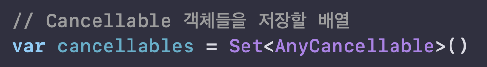 이후 수신 과정 중, 구독/수신 관계을 cancellables 변수에 저장하도록 했습니다.